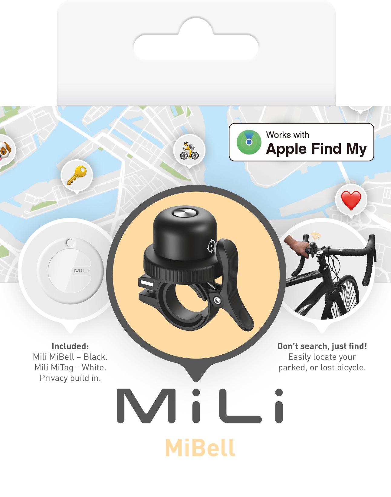 MiLi MiBell er en sykkelklokke intergrert med MiTag Bluetooth-sporing. Ved hjelp av ‘Finn Min’-appen på din iPhone eller iPad kan du enkelt lokalisere sykkelen din.